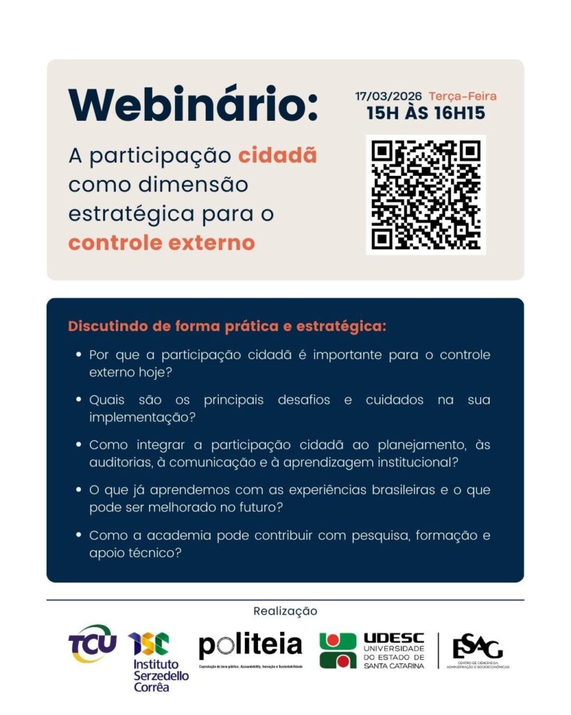 Para conhecer e debater as aprendizagens com essas práticas e os caminhos para avançarmos mais rápido, nos vários pontos do sistema de controle, o grupo de pesquisa Politeia, da Universidade do Estado de Santa Catarina, Udesc, em parceria entre o TCU, o Instituto Serzedello Corrêa e diversos interlocutores e parceiros, está realizando em 2026 pesquisas e uma série de debates online.
