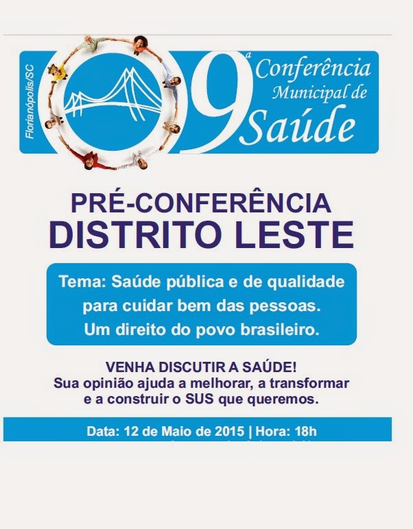Nesta 3a feira, 12 de Maio, às 18h, acontece a Pré-Conferência Municipal de Saúde para o Distrito Leste de Florianópolis.