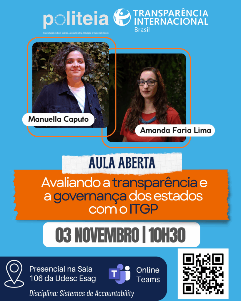 Para participar remotamente, basta acessar este link que dá acesso à sala ou escanear com o celular o QRCode no cartaz abaixo para ser direcionado/a à sala que transmitirá o debate com mediação. A programação completa pode ser na página Trilha Equigov Controle Aberto aqui.
