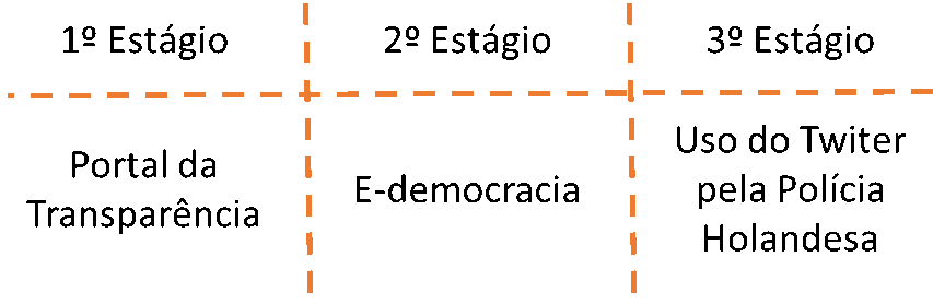 Podemos então observar que os governos têm passado por alguns estágios no que se refere à accountability e o uso da tecnologia como facilitadora da sua efetivação. Conforme o esquema a seguir, temos em um primeiro estágio um mecanismo de comunicação para a divulgação de dados em cumprimento de uma legislação, representado pelo Portal da Transparência, sendo esta uma forma de comunicação unilateral. Já na evolução desses mecanismos no Brasil, temos o surgimento de ferramentas como o E-democracia, um portal proposto pela Câmara dos Deputados, com o intuito de dar voz ao cidadão na cocriação de leis a partir do diálogo. Em um terceiro estágio, que ainda é bastante incipiente, teríamos o uso desses mecanismos para uma comunicação direta e rápida entre cidadãos e agentes públicos, como é o caso do uso do Twiter pela polícia da Holanda.
