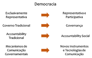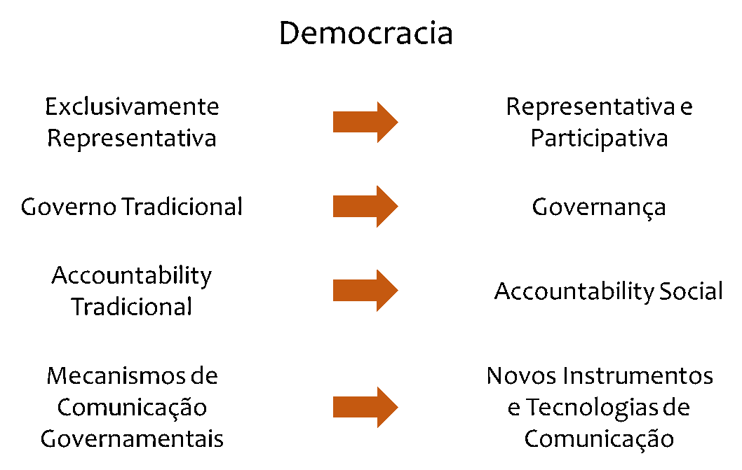 A partir do esquema, vemos que, seguindo uma ideia de evolução, há mudanças nesses mecanismos de informação e comunicação que vem ocorrendo gradualmente, contribuindo para aprimorar a participação popular e a responsabilidade governamental. Nesse sentido, esses novos instrumentos e tecnologias para a comunicação são vistas, a partir de diversos casos, como facilitadores para a efetivação de um ideário de democracia participativa, partindo da ideia de governança e de accountability social.
